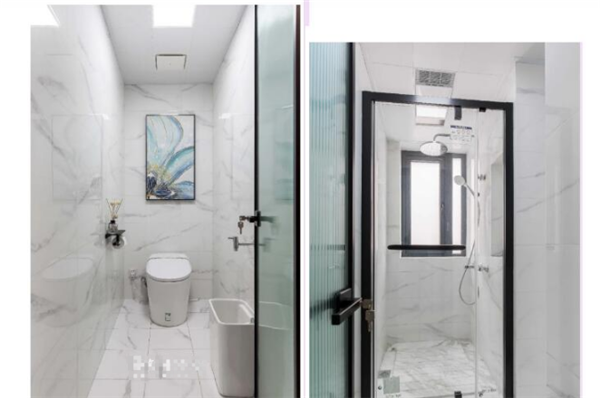 原户型卫生间比较小,设计师采用三分离的设计方案,干湿区完全独立,淋浴间和马桶间用的是现在比较流行的长虹玻璃门,保证透光的同时也能起到一些隐私作用,很有质感,且空间利用率也非常高。