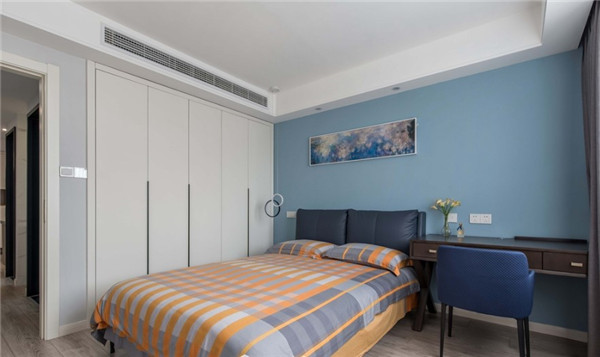 次卧依旧是湖蓝色的墙面,与客厅形成呼应,墨蓝色软包床头,橙色条纹床饰点缀了整个空间。床头放上一个小书桌,办公休闲都可以,象牙白嵌入式衣柜很好的利用了墙面空间,无把手设计更是诠释了整个空间的简约大气。
