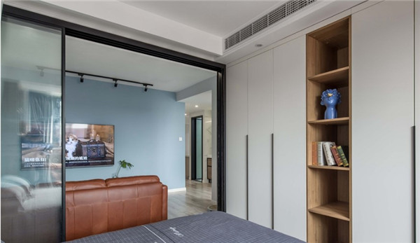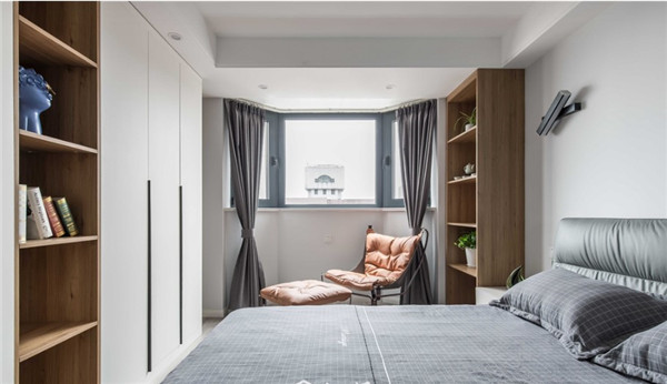主卧外凸的阳台增大了视觉空间,放上一个躺椅也是很惬意的,顶天立地的收纳柜,中部留空设计,可以用来摆放小个艺术品或常看的书本,取用都很方便。