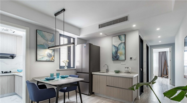 餐桌放在离厨房最近的位置,做好的饭菜可以第1时间上桌,冰箱的放置位置也在大限度上缩短了家务动线,内嵌洗手盆的操作台也超级实用。