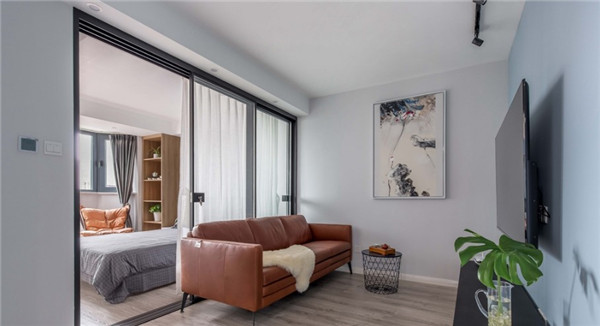 本案原户型是没有客厅的,设计师采用三联动的黑框移门,隔断出一个独立空间做客厅。温柔的触感、自然的光线、细腻的居住感,空间中的透与藏组合出更多设计的可能性,也创造出小方圆里的大内容。