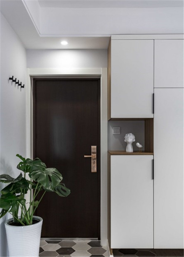 入户玄关处右侧墙面放置了精美的挂钩,左侧依托墙面设计了玄关柜,完美解决了收纳、置物的问题。地面采用六边形地砖与木地板拼接的铺贴设计,划分出入户门厅的空间过度,起承转合更加自然。