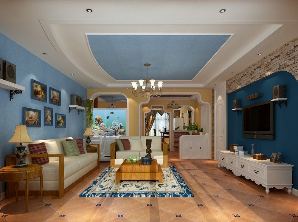 2、在家具选配上,通过擦漆做旧的处理方式,鹅卵石等,表现出自然清新的生活氛围。将海洋元素应用到石材等,用来营造浪漫自然。在色彩上,以蓝色、白色、黄色为主色调,看起来明亮悦目。