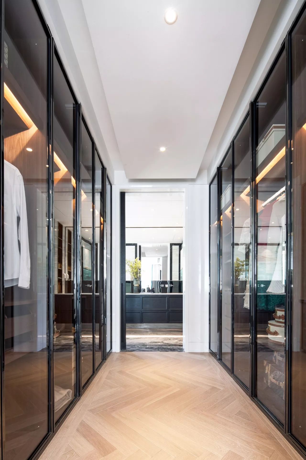 轻奢风格对材质非常讲究。金属、玻璃、大理石等元素,都能营造高品质的生活。而玻璃质感通透,兼顾实用性和美观度,不仅在无形中扩大了衣帽间的空间,增加层次感,同时给人梦幻、精致的感觉。
