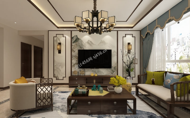 【西安紫苹果装饰集团】万和郡135㎡新中式风格设计案例~风效果图