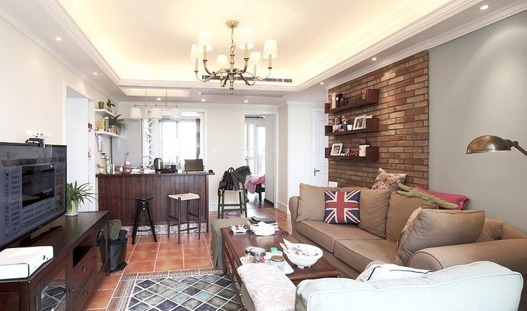 美式风格装修,它讲究色调统一。比如茶几、餐桌、边柜等家具选择的都是统一色彩;沙发背景和电视背景选择的也是相同颜色相同图案的壁纸;在美式装修风格中的客厅灯与餐厅灯选择也是同款灯饰等等。