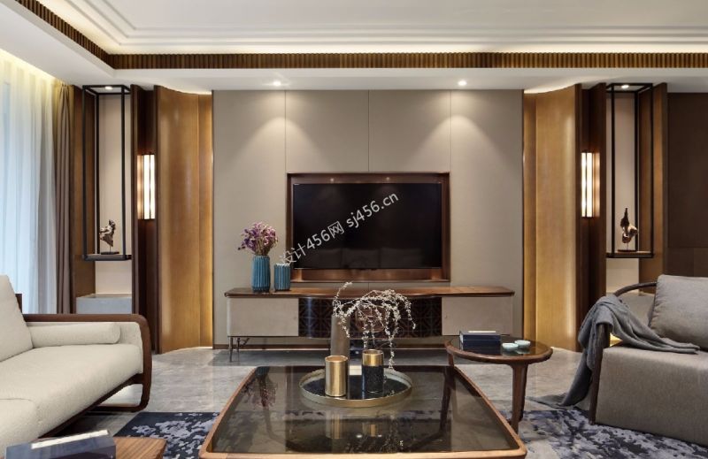 绿地曲江名城110平米现代中式三居室装修案例风效果图