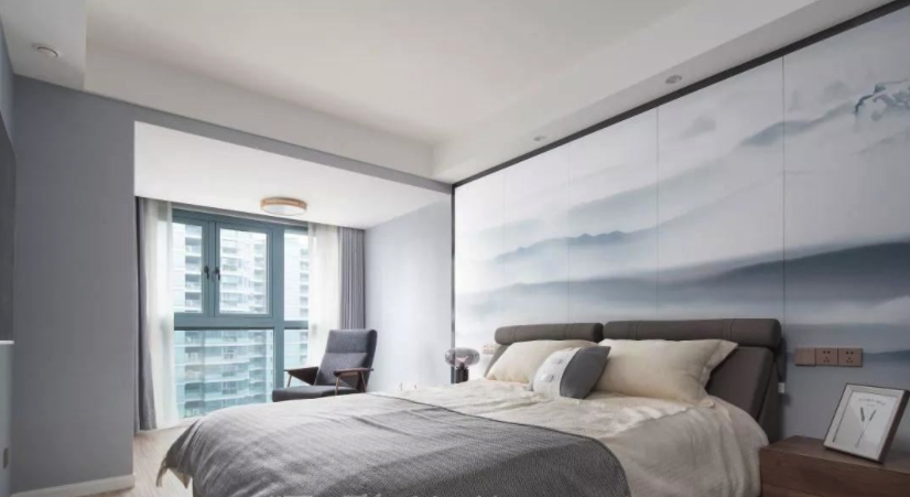 卧室空间整体以浅雾蓝色作为主角色,大面积雾蓝色晕染,营造一种似是而非的朦胧美感。