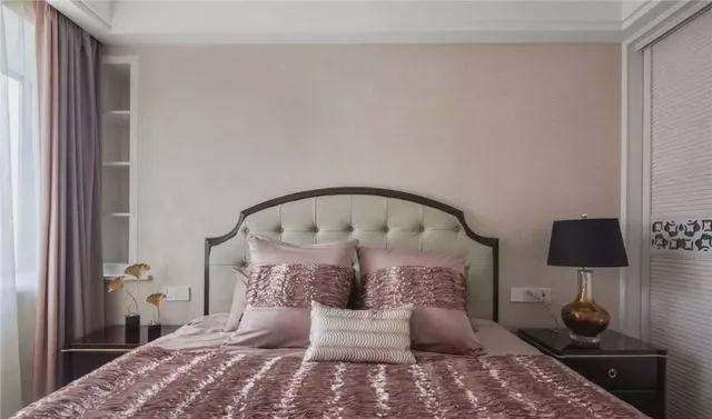 主卧以粉色墙面装饰,结合粉色的被单,使这个空间充满了女性的优雅与浪漫。