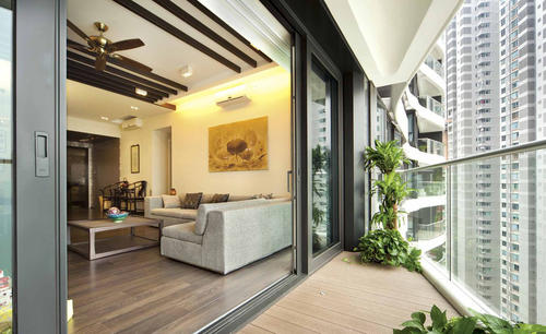 客厅阳台一体化设计,安装大面积透明的玻璃落地窗,这样不仅可以让户型空间更开阔,还可以有很好的观景效果,站在窗前我们就可以欣赏到窗外的美景,将室外的景观很巧妙的融入到室内。要注意的是在选择材料时要采用比较好的安全玻璃。