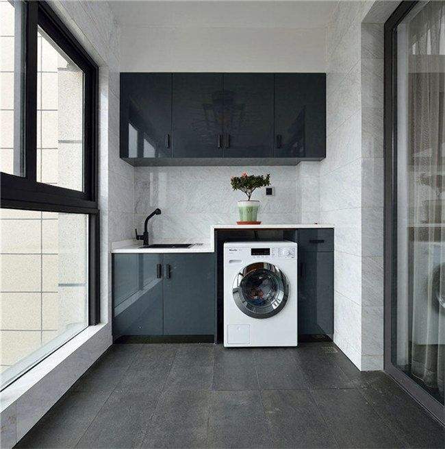 一般洗衣机都是放在卫生间的,但是卫生间面积如果比较小,可以利用阳台空间设计成洗衣房、拖把清洗区、晾晒衣物和清洗抹布等盥洗功能区,这样解决小卫生间的烦恼,比较注重生活实际需求,这种阳台设计要注意防水和排水等问题。