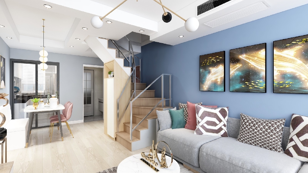 01-10该案例采用现代风格为主基调,却大胆的将客厅背景墙染做蓝色,运用窗帘、地板、沙发的层层递进,打造出一幅深海般静谧清新的客厅装修效果图。