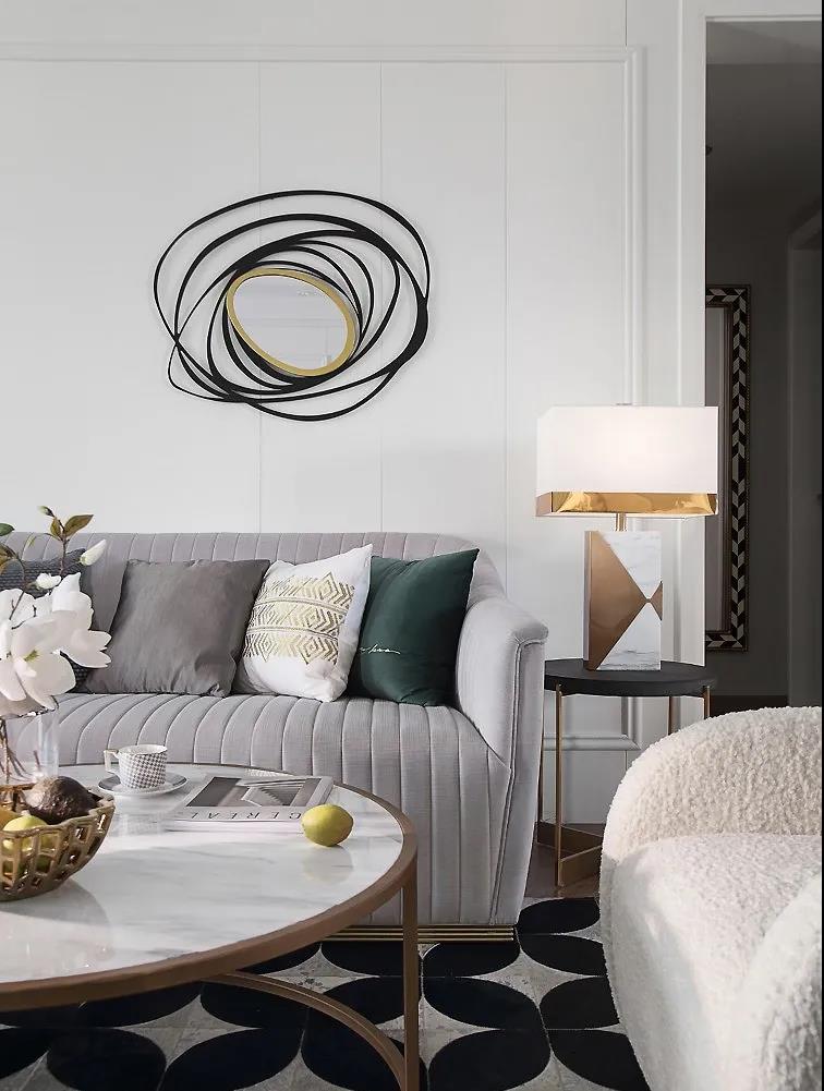 黑白两色的毛绒地毯图案精美,提高了整屋的档次,大小不同的两个圆形茶几,清爽而圆润,白色大理石配上金色柱脚,充满精致感。
