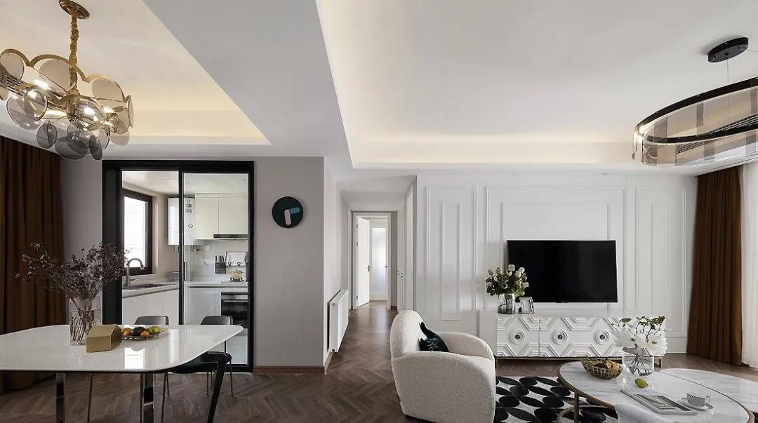 客厅与餐厅通过吊顶分隔两块功能空间,咖色的鱼骨拼地板,让空间充满优雅精致的魅力。