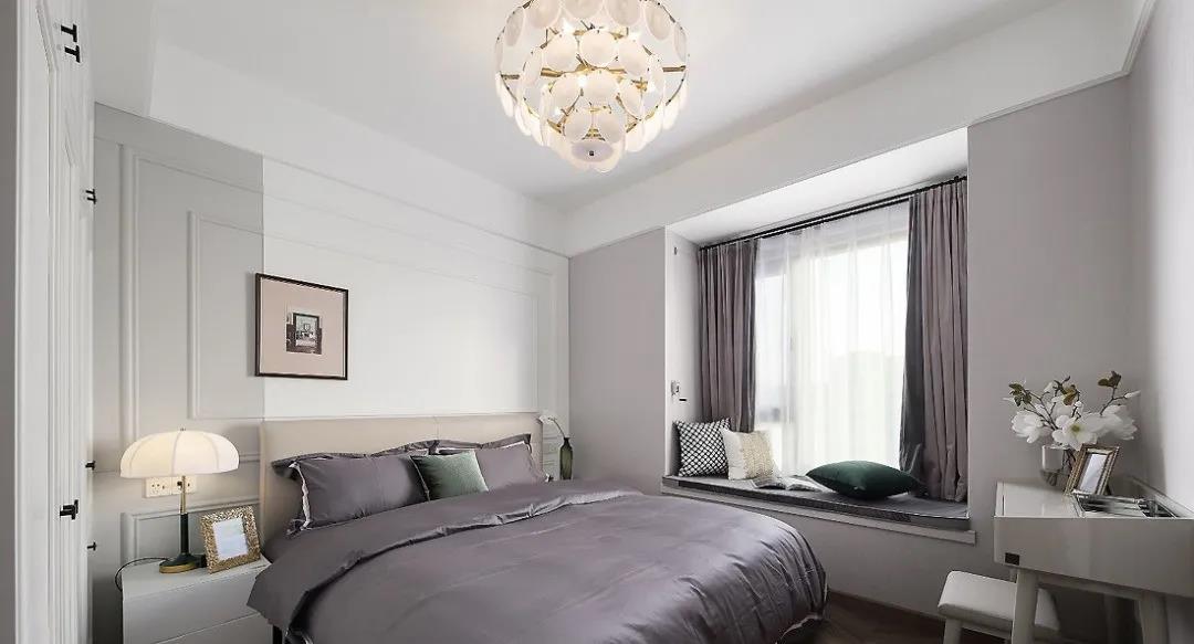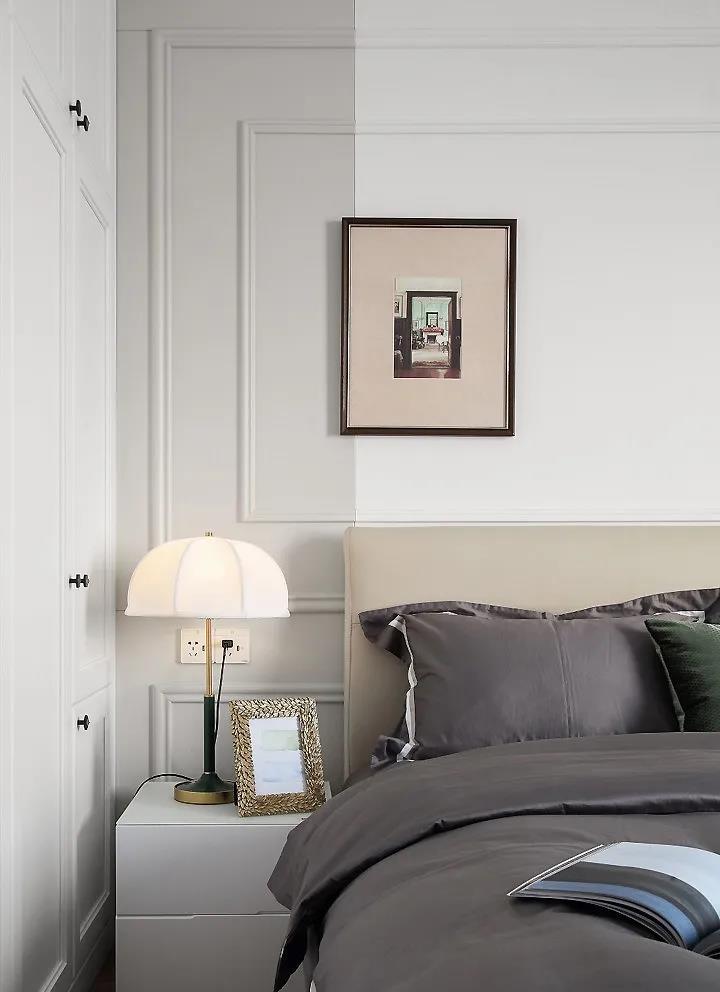 主卧整体干净清爽,高级感满满,床头背景的护墙板做了分色,白色搭配浅灰色,给静谧的空间带来一丝时尚气息。
