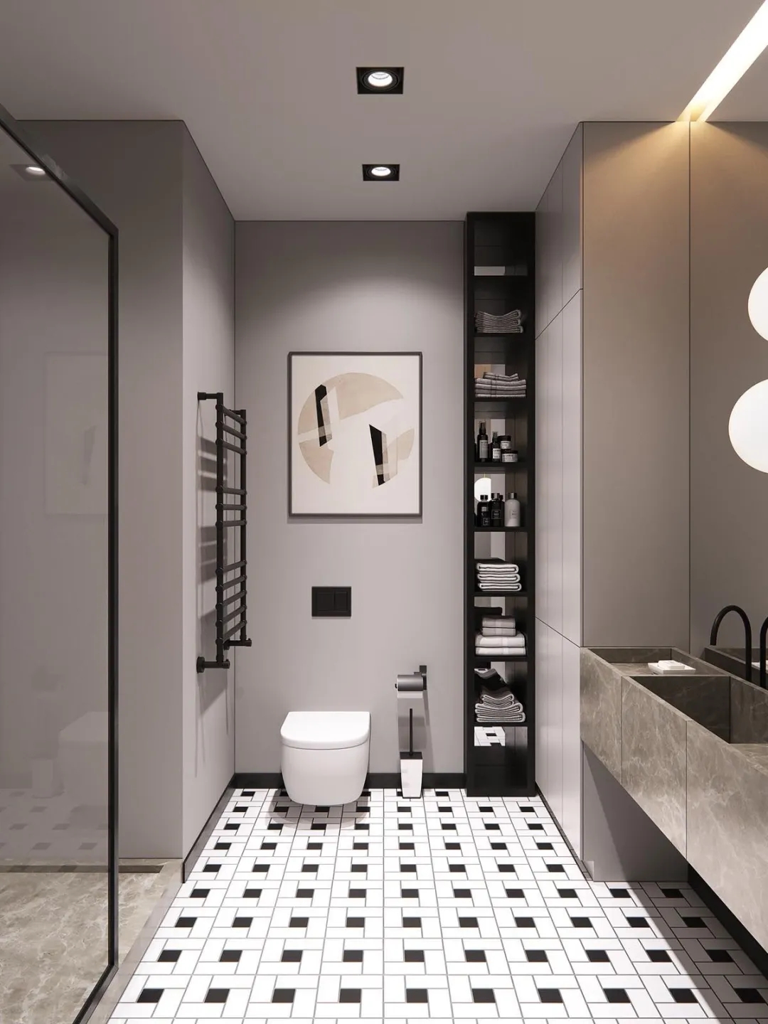 如果你家的卫生间不适合做壁龛,那就考虑多装几个置物架,也可以充分利用垂直空间,让卫生间变得干净整洁。