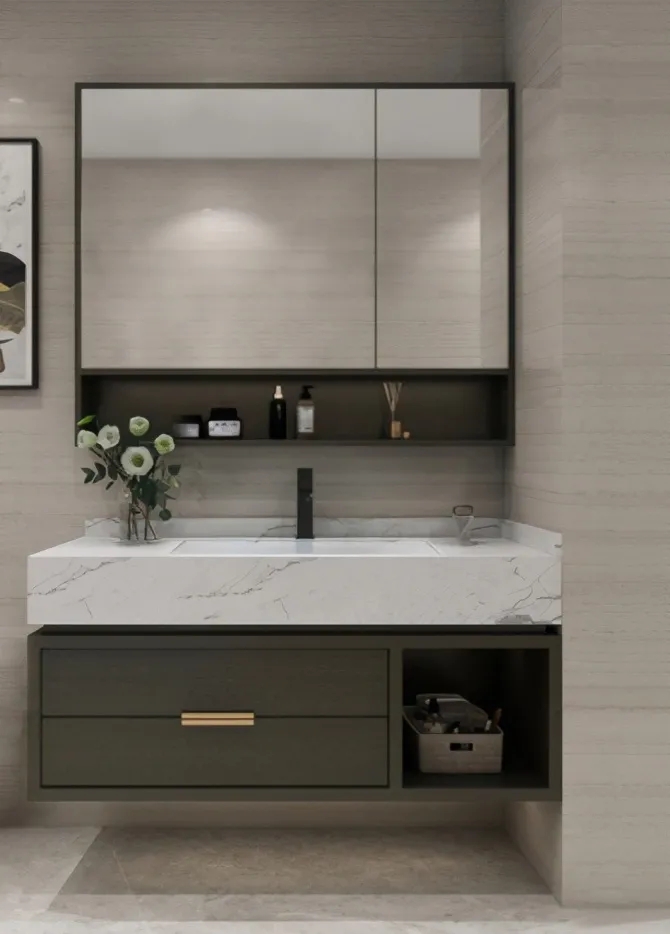 为了方便收纳,拒绝杂乱,小编建议你在选择浴室柜时,尽量选多个分区设计的,这样可以满足不同的收纳需求,让各种小杂物有序安放,合理归类。