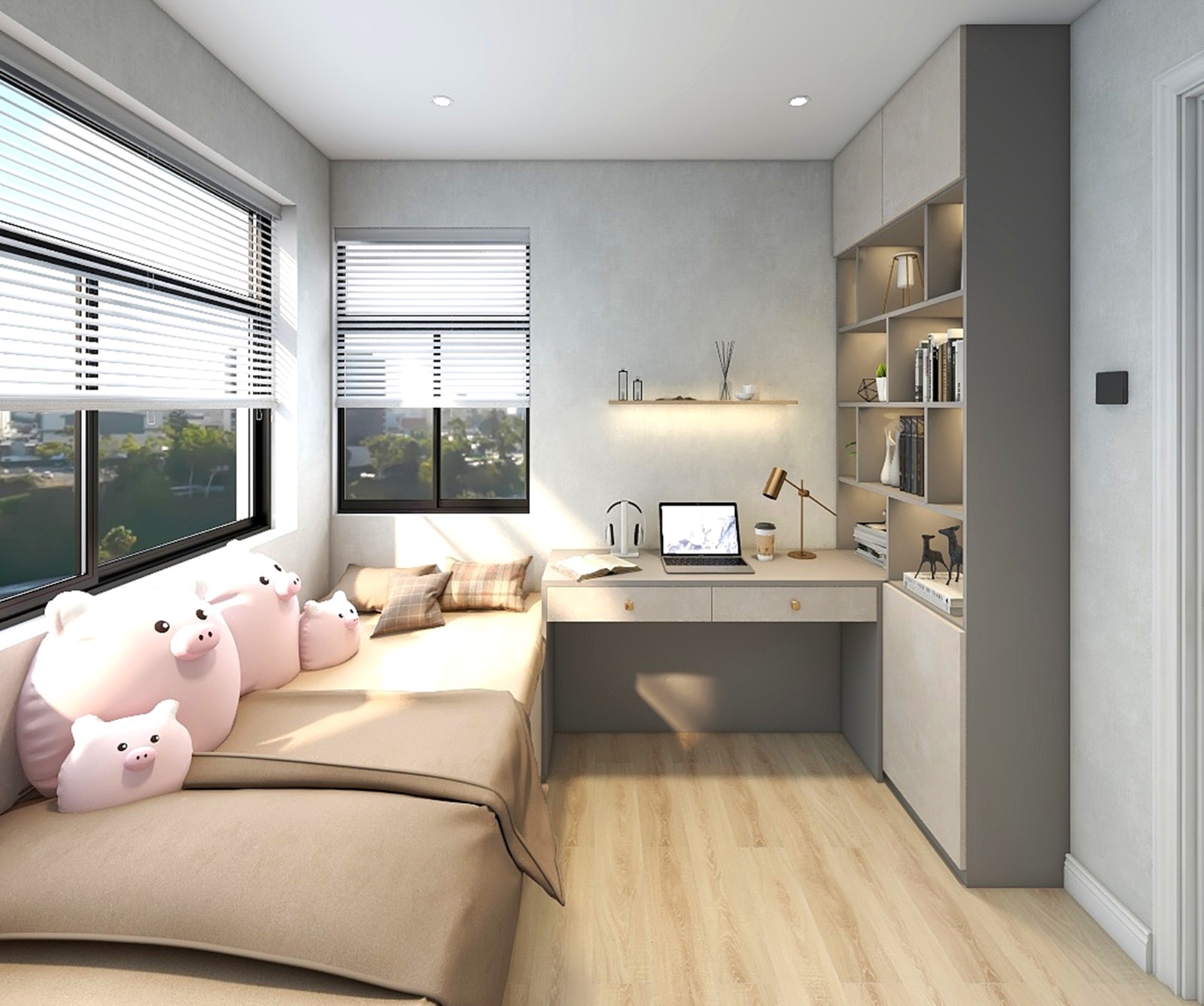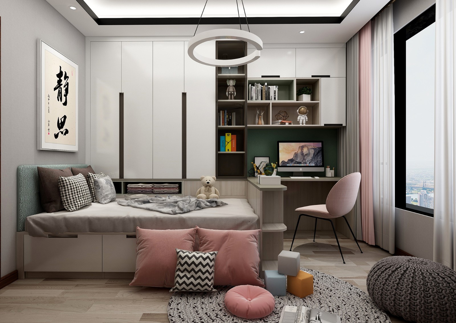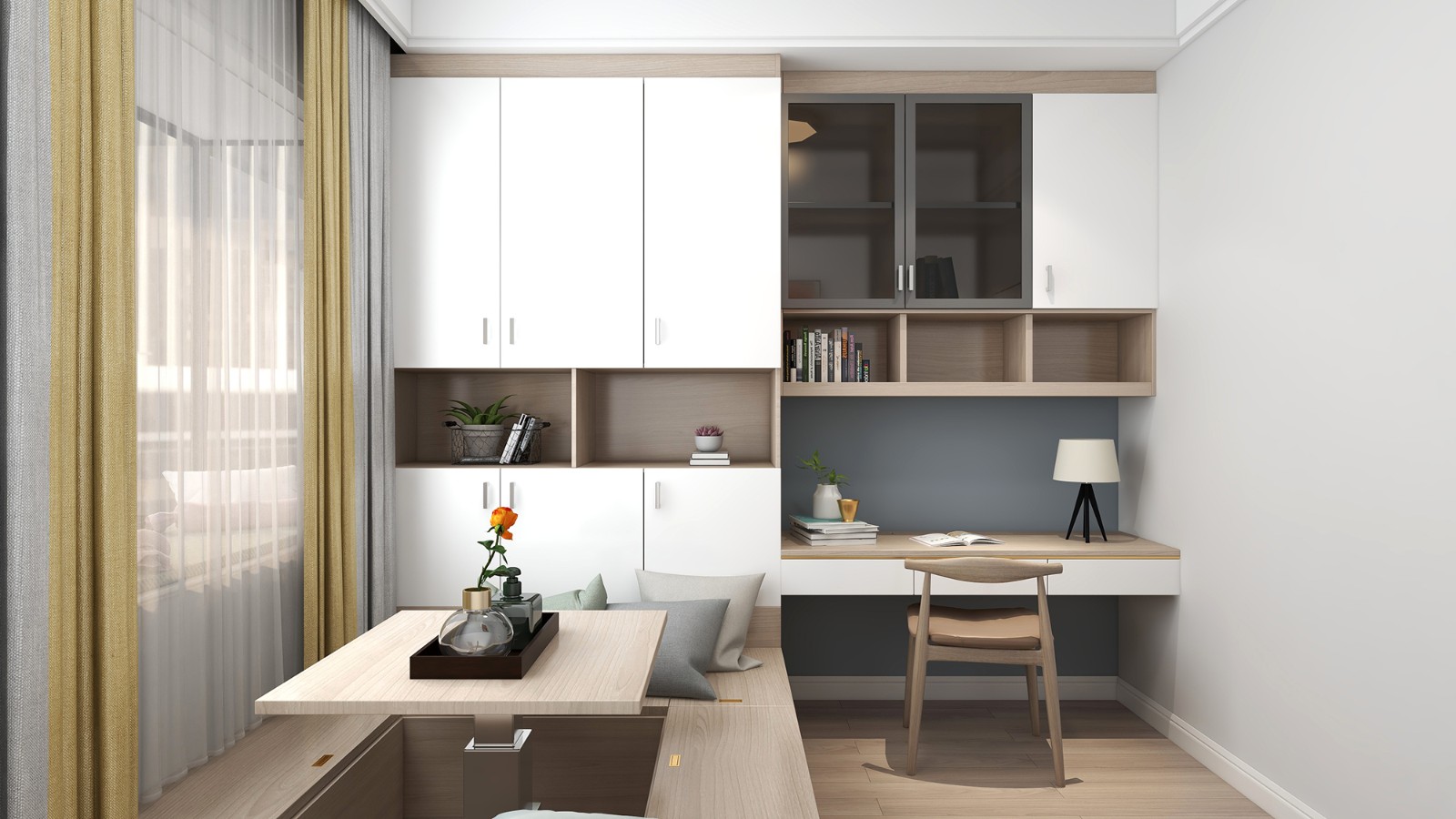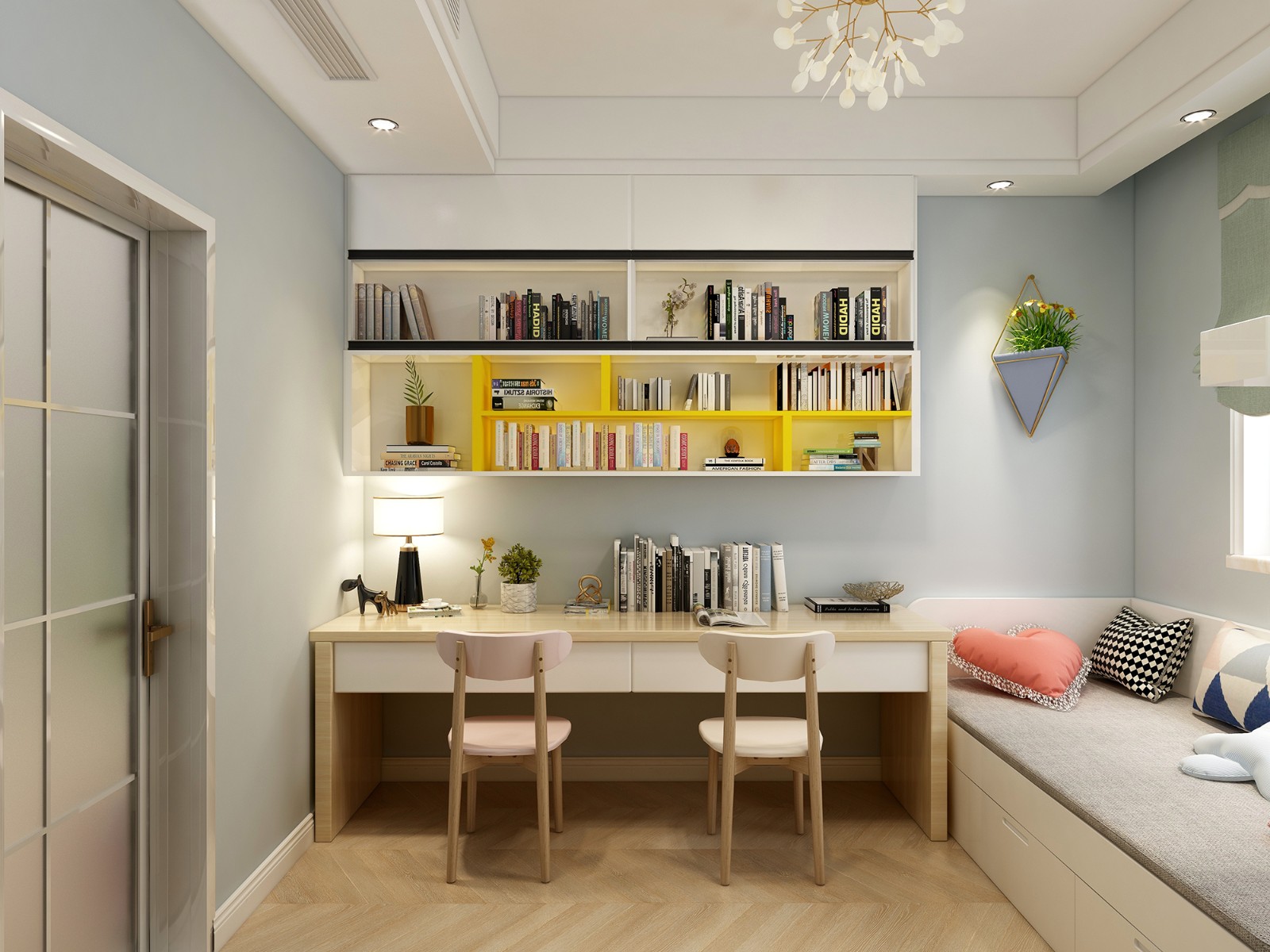 家中成员较多,单人书桌椅很难满足家人需求,双人书桌椅,书柜采用吊柜,节省空间,还能满足孩子需求。