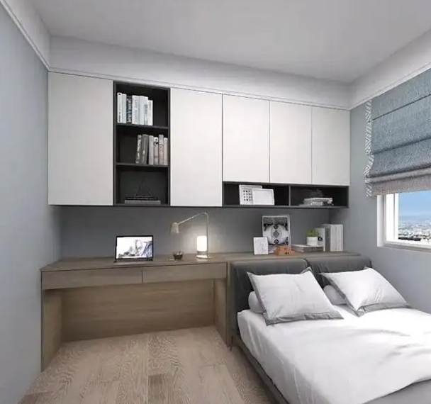 正是因为房间的空间大,才应该使家具的摆放显得拘谨,可以安装两个壁橱,这样能够让整个空间显得更加干净整洁。
