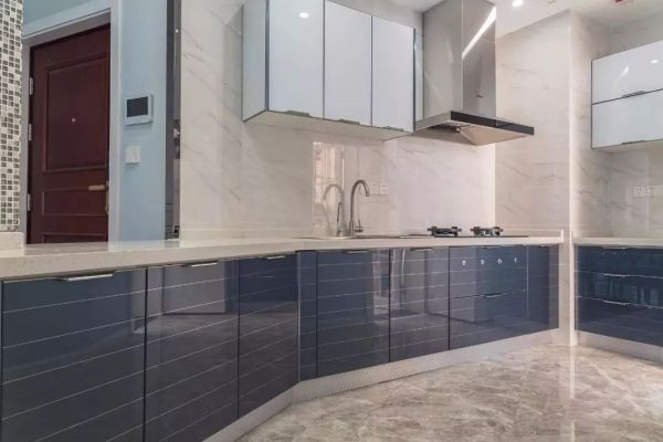 餐厅旁边就是厨房,厨房设计成开放式更显空间宽敞。因为户型不规则,厨房沿着墙面布置橱柜,还有吊柜增加收纳,整个厨房看起来干净利落。