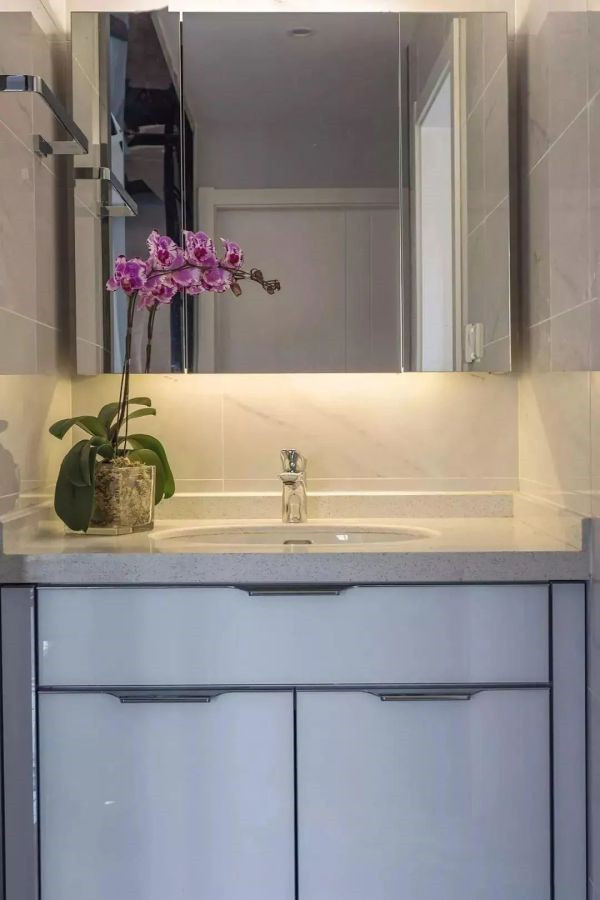 卫生间将洗漱区移至门外,不但干净卫生,也更实用,镜柜还满足了洗漱用品的分类收纳,让台面整洁清爽。