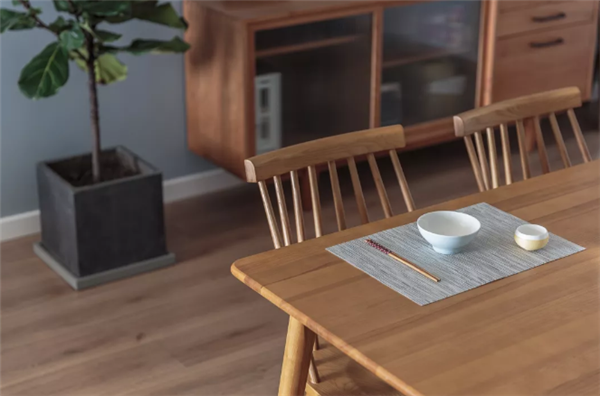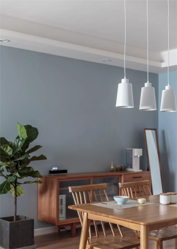 原木极简风的餐桌,长板凳+温莎椅的组合,餐桌上方吊着三盏白色吊灯,使得用餐氛围温馨舒适。