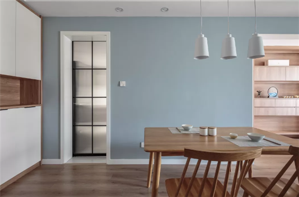 客餐厅一体的格局,以灰蓝色主调的墙面漆;在小小的户型格局基础,以实用宽松的布局,布置着灰色布艺沙发,营造出一个简约大方的空间氛围感,舒适轻松又自然。