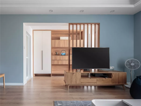 电视墙打掉一半做成木质屏风,使采光较差的客厅更加自然明亮。搭配上木质电视柜,呈现出一个宽敞自然的电视墙,简约舒适又大方。