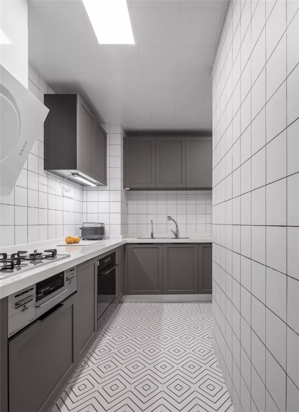 厨房以回字形的地面砖+白色小格墙面砖。搭配灰色橱柜,为主人提供了一个文艺轻松的烹饪空间。