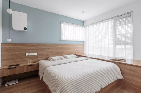 定制一体的床头柜做到了靠墙位置,带来实用自然的空间感顶上的北欧风吊灯,也增添了空间的文艺舒适感。