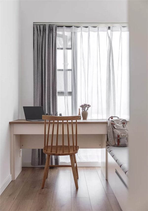 简洁舒适的定制书桌+温莎椅,书桌底部留空让窗户的光线进入卧室,呈现出一个轻松自然的空间质感。