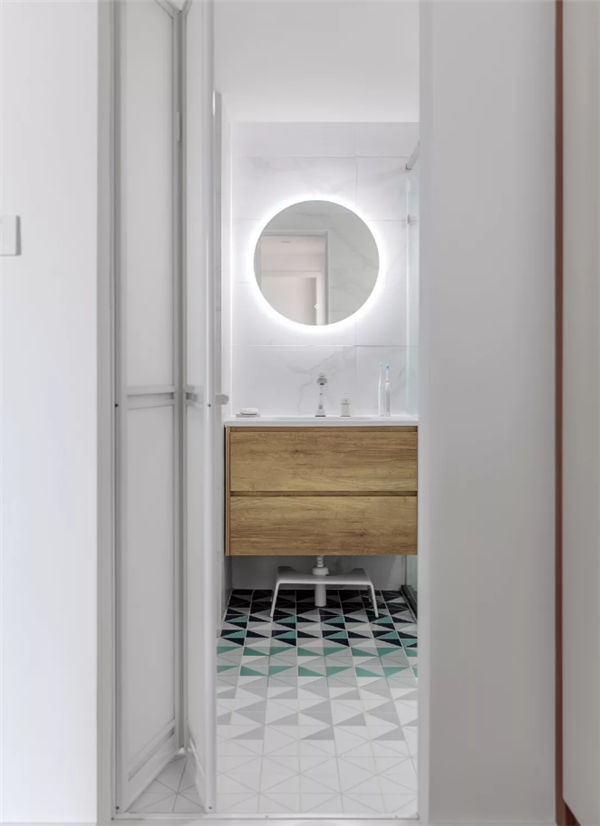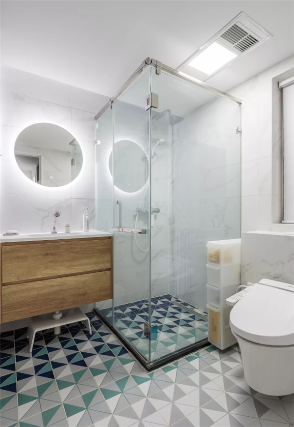 卫生间地面以灰白青三色拼接的三角图案地砖,铺贴出一个充满立体感的画面,结合雅白的墙面砖,木质洗手盆柜+圆形背光镜面,呈现出舒适温馨的画面感。