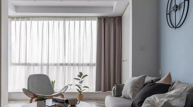 以玄关过道为分界线,左手边是客厅右手边是厨餐厅;往客厅首先看到的是沙发墙,清新的北欧风中怎么能少的了清新的色彩呢?设计师以天蓝色墙漆搭配黑色创意造型的钟表把简约的沙发墙就装饰好了;灰色的布艺沙发旁放一盆绿植,很是温馨;