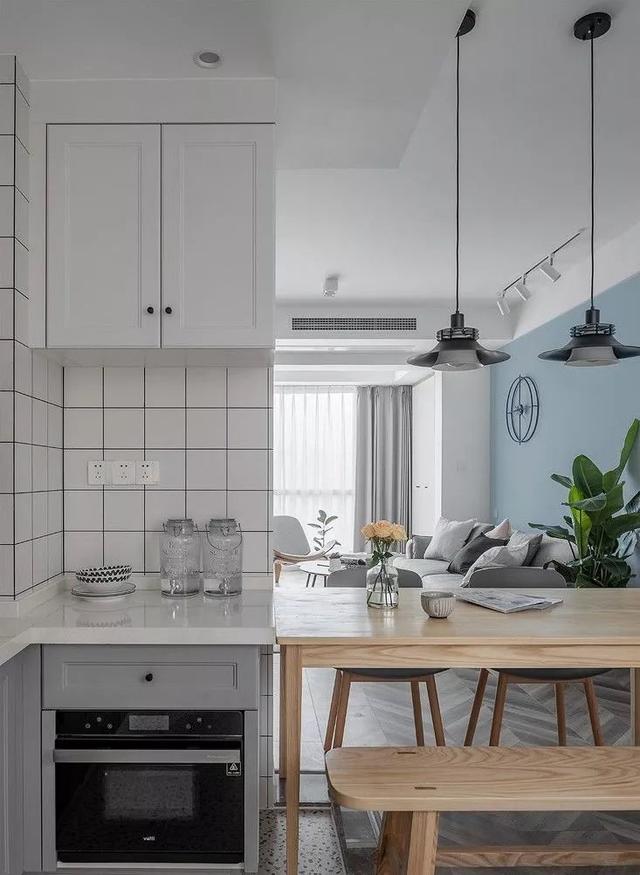 原木色的餐桌搭配灰色的餐椅,是经典的北欧原木风的特色,餐桌靠墙放,可以有足够的过道通往厨房而且另外一边靠墙还做了一排餐边柜,对于小户型来说,合理的柜子真的很有必要,这样可以放家里整洁很多;