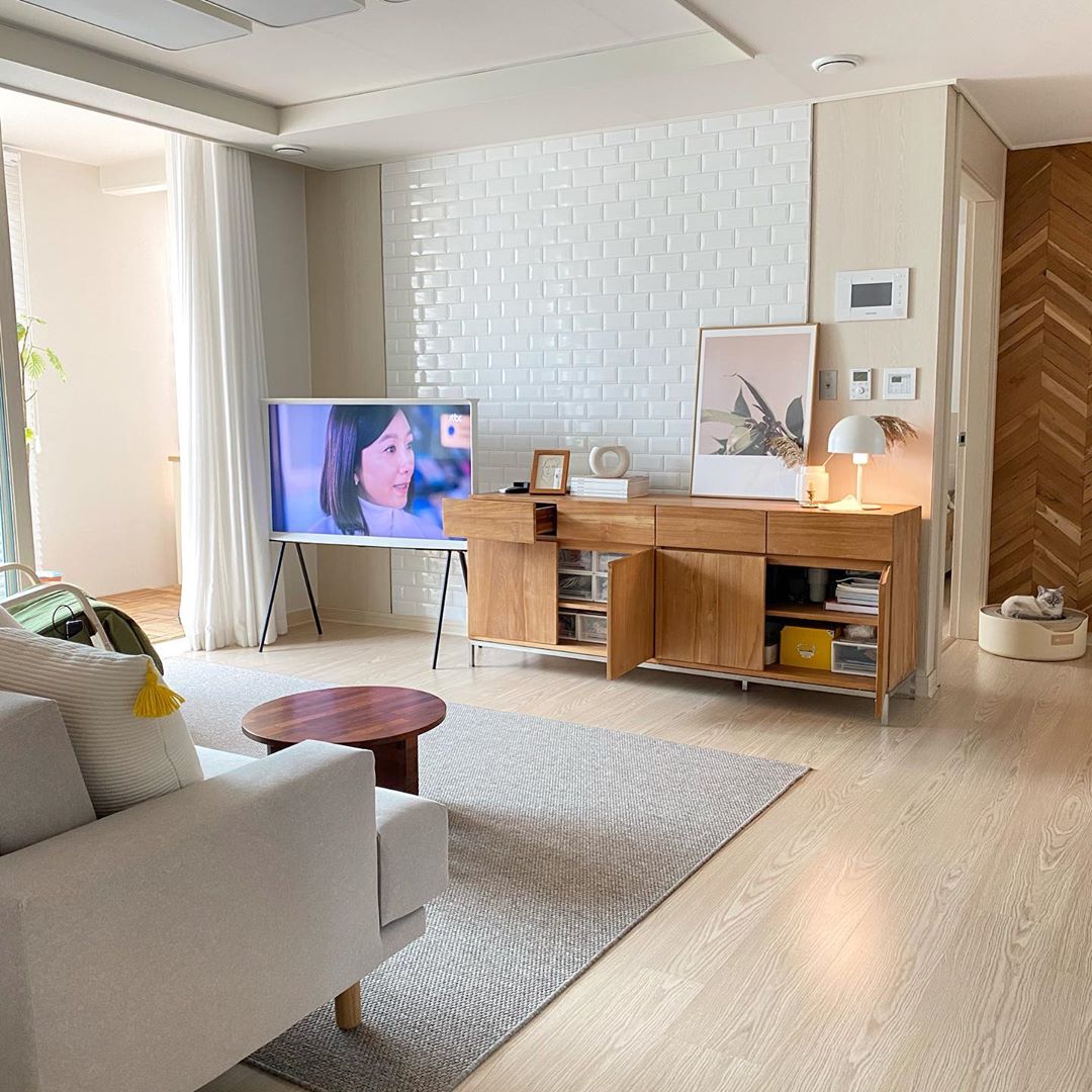 沙发背景墙是普通的大白墙,电视背景墙则是白色小方砖上墙,空间瞬间就多了很多的立体感。