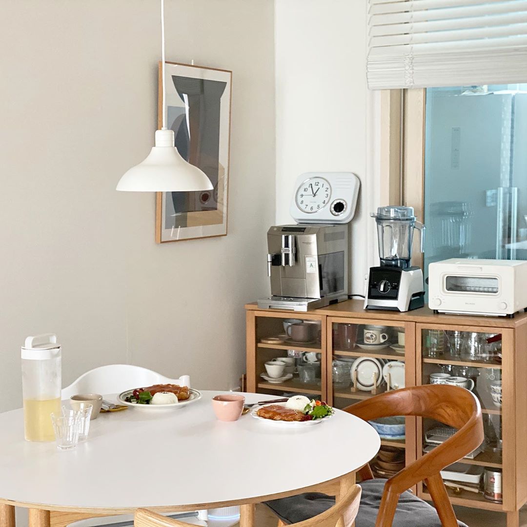 餐桌选择的是白色桌面的原木餐桌,餐椅选的也是两种颜色。利用颜色的深浅制造空间的层次感,是家装中很重要的一个点。