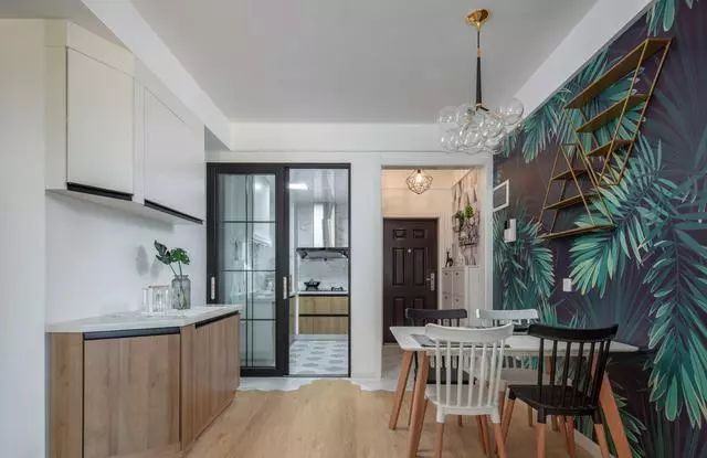 餐边柜和餐桌各靠一边墙这种比较适合长条形的空间,中间要预留空间来做过道。