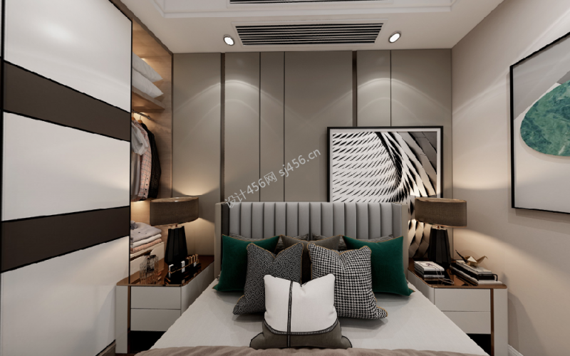 110平现代简约卧室背景墙三居装修效果图