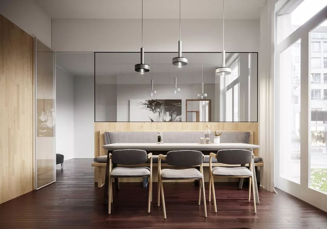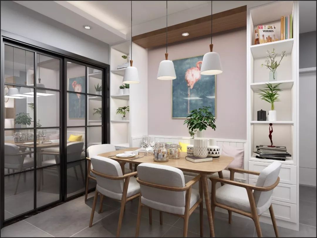 双面卡座设计的最佳位置是窗户,不仅能作为用餐地方,还能作为休闲区使用,一边阅读一边欣赏美景。