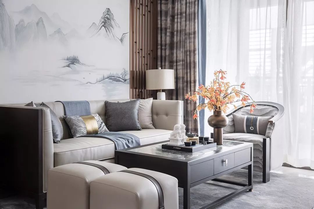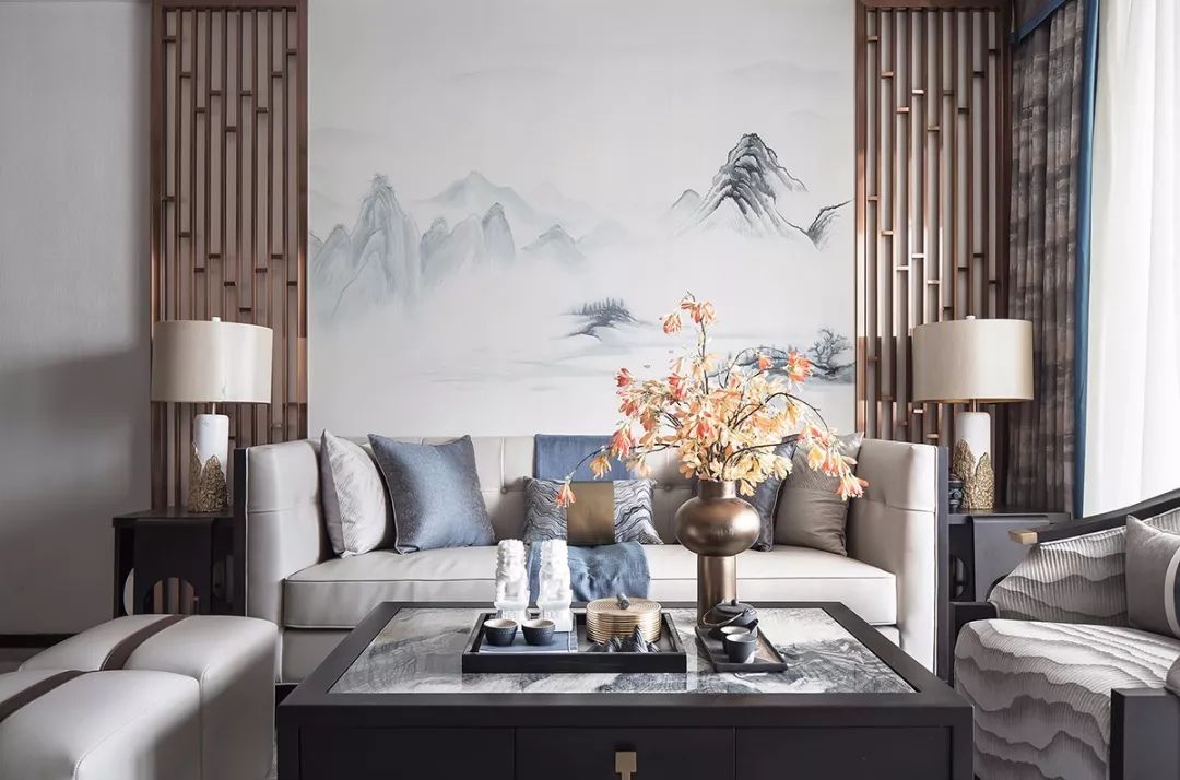 背景墙用水墨画做装饰,两侧还设计了对称的栅栏,搭配米色的皮质沙发,呈现出一种舒适宁静的空间意境。