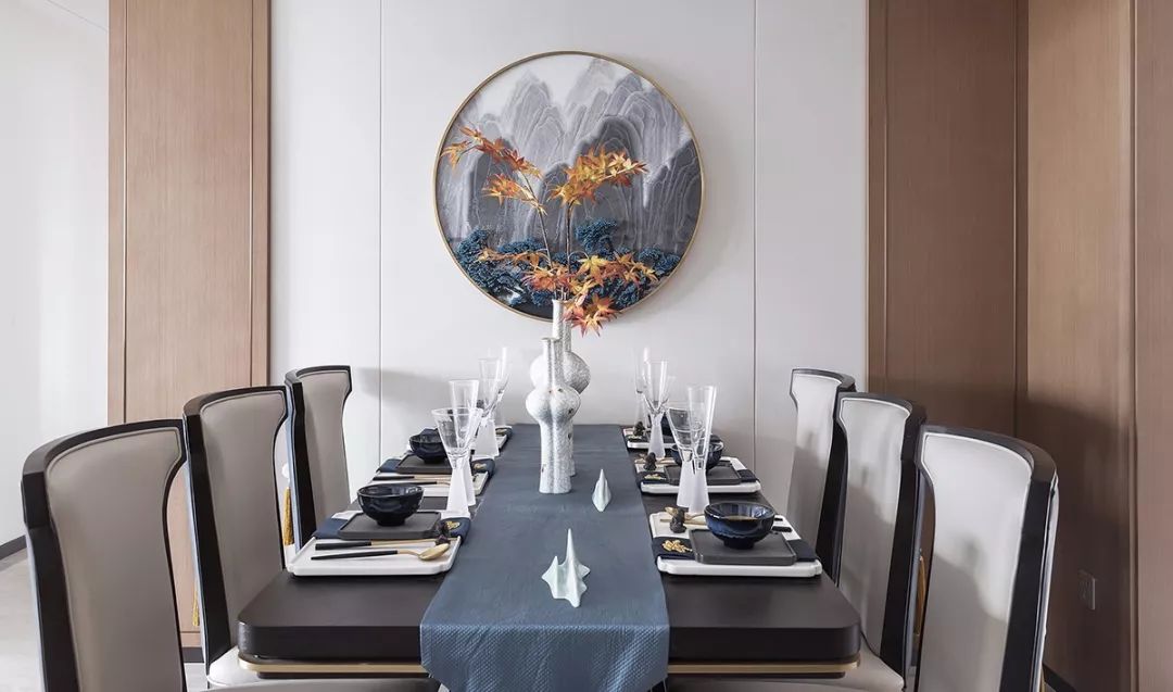 墙壁上的圆形装饰画和中式吊灯,搭配精致的餐具,透露出一种东方哲学的美感。