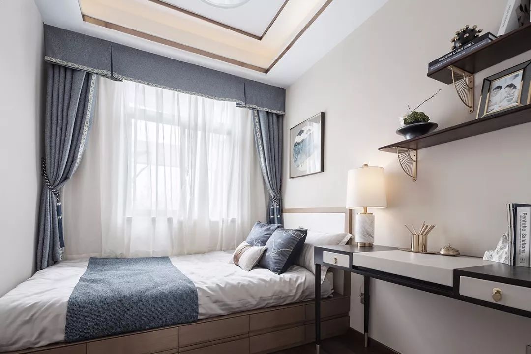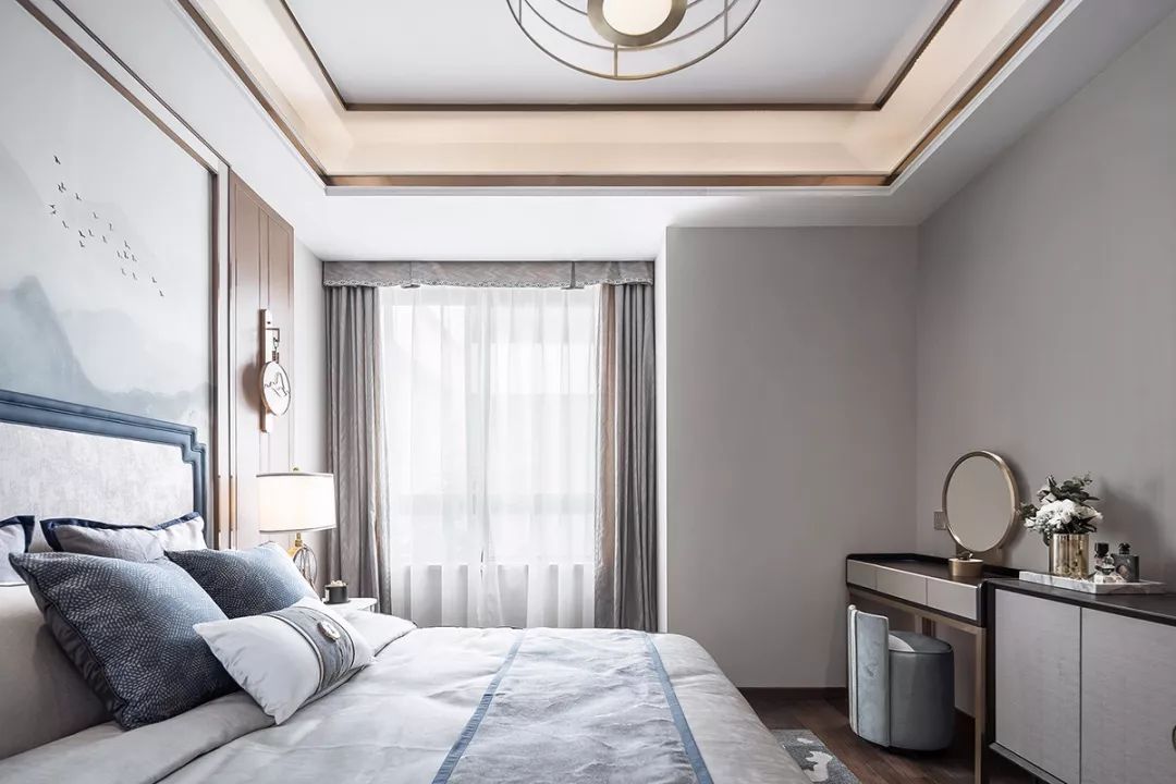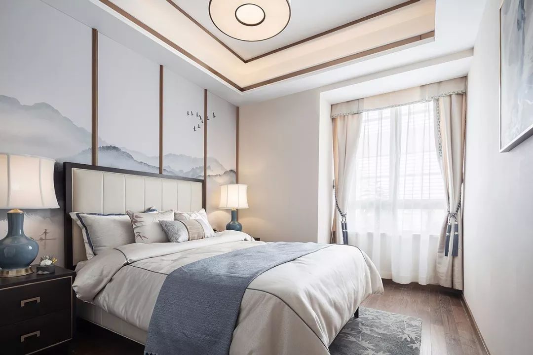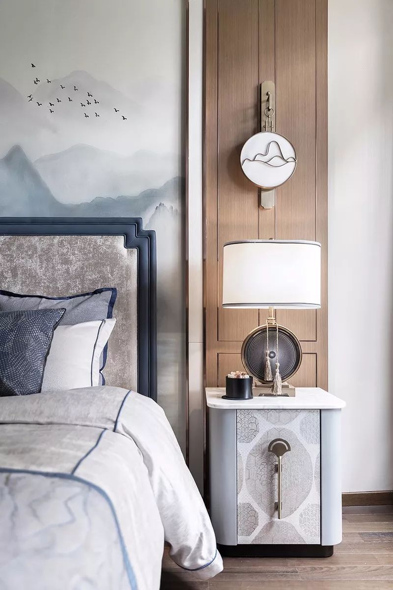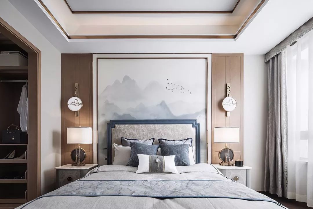 主卧水墨画的背景,呼应了客厅的设计,简洁的线条、清寂的装饰,精致的家具,显得空间舒适有优雅。
