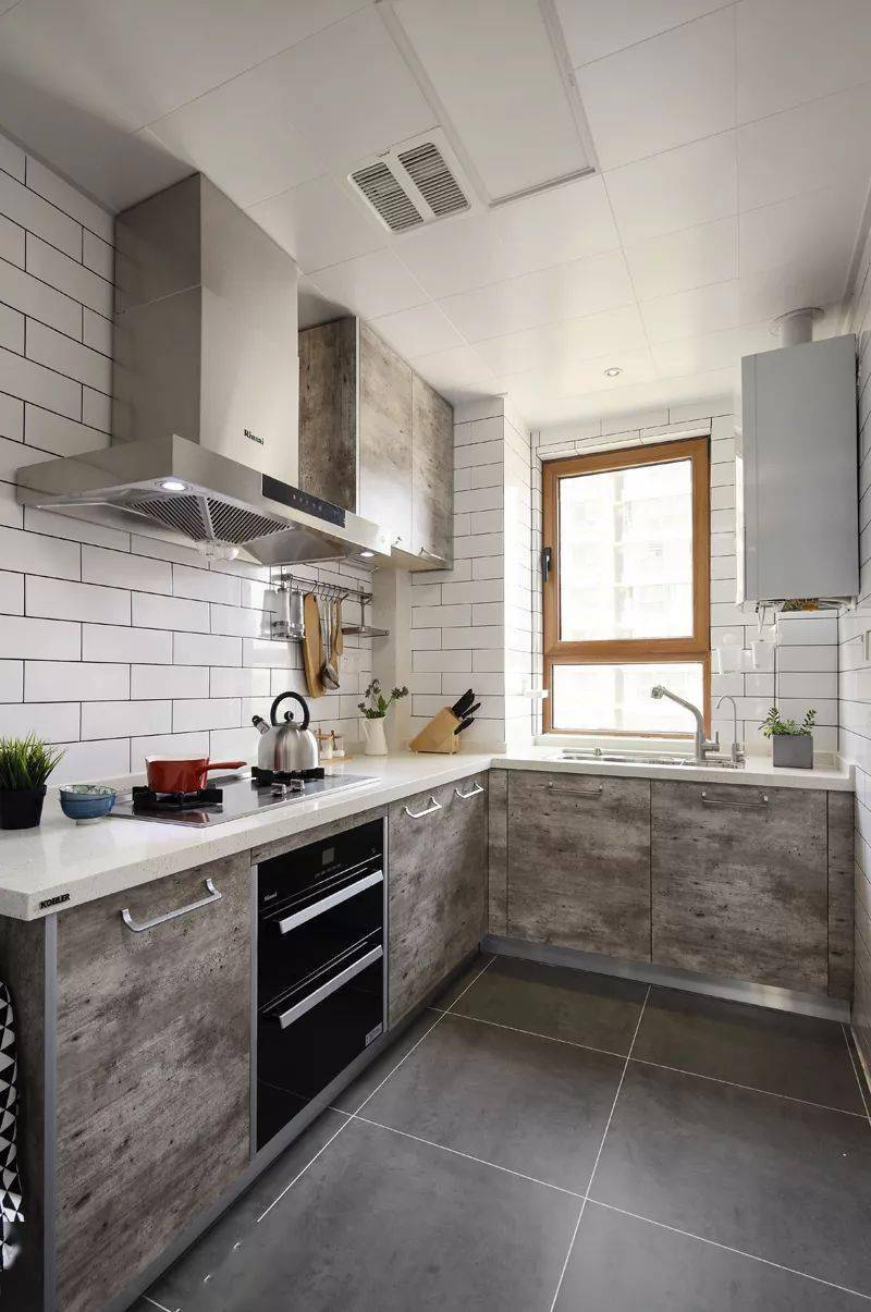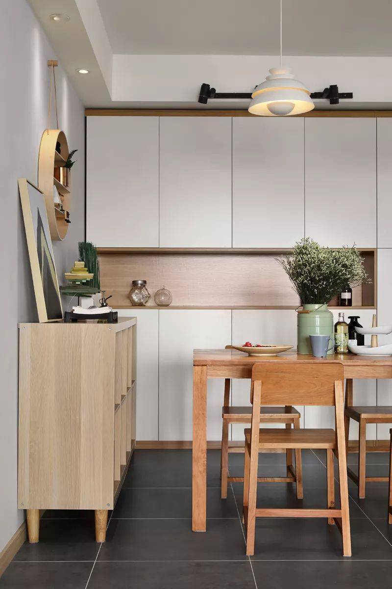 厨房的地面选择了和客餐厅一样的灰色地砖,橱柜做成了复古的木质,墙面大部分的留空,虽然收纳空间少了,但看起来也更不会拥挤。