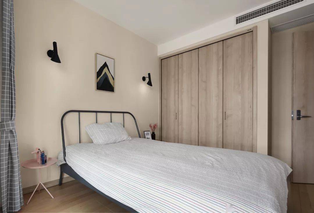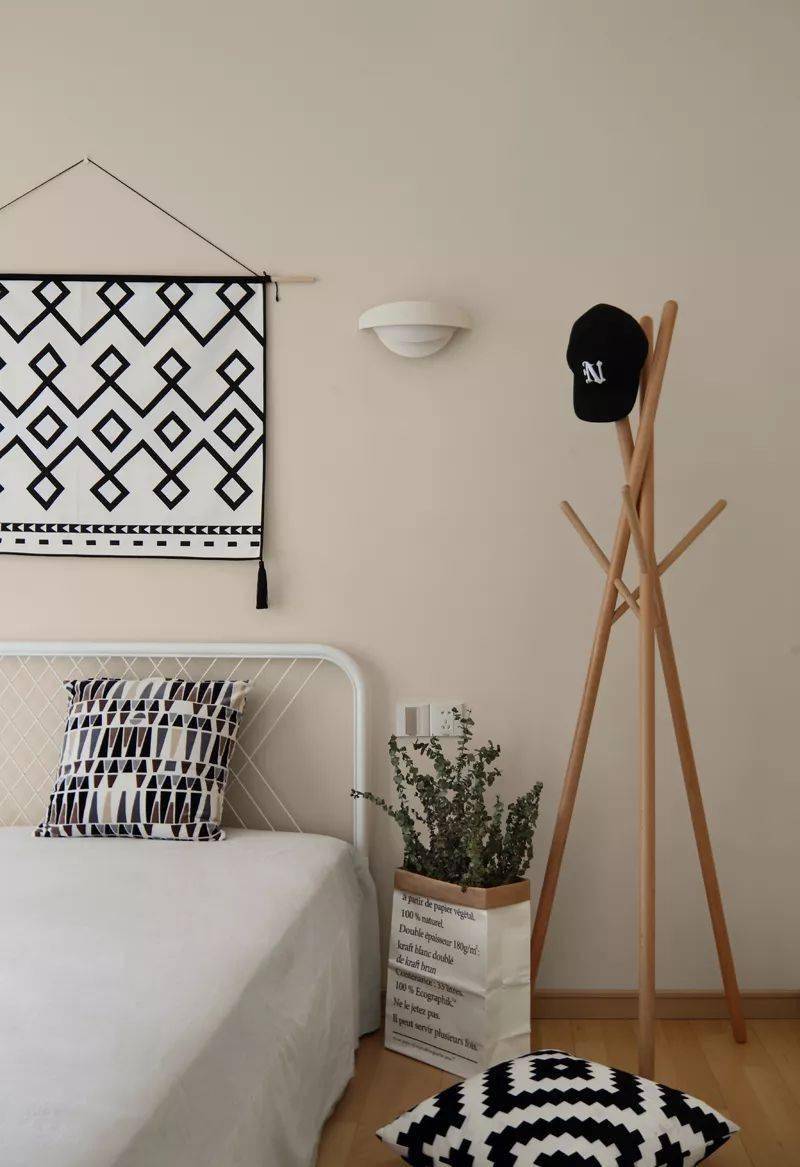 儿童房同样选择了铁艺床,用线条勾勒的靠背更为有趣。在床头摆放衣架和绿植来代替床头柜,让儿童房显得更为宽敞。
