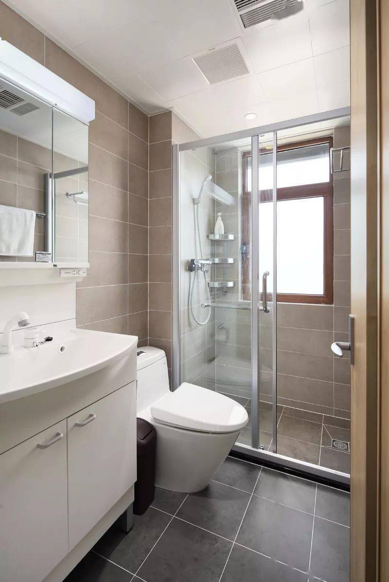 卫生间内做了干湿分离的设计,灰色的地砖搭配棕色的墙砖,组合型的浴室柜和淋浴区内的置物架结合,这个卫生间简单而又实用。