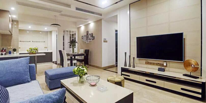 客厅是品味象征,体现了主人的品格地位,也是娱乐交友的场合。电视背景墙采用石膏板的四个几何造型,即简单大方,再加上米黄色的壁纸,配上顶部照下来的灯光,整个电视背景墙把客厅提升起来。