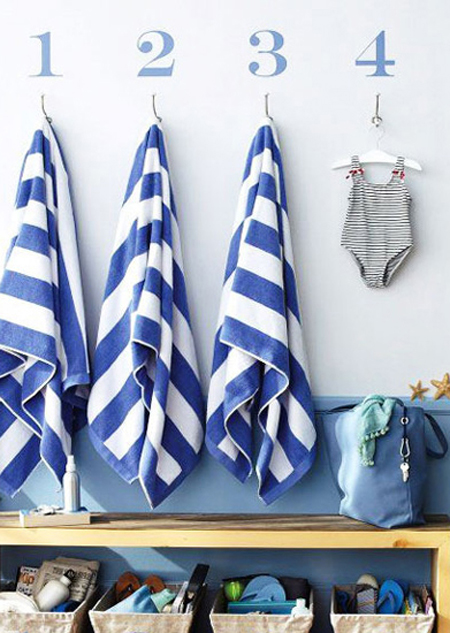 海蓝色玄关布置,打开门就带来慢慢的地中海清新感。简单的挂钩以及长凳以及收纳篮子都是很实用的布置方案。