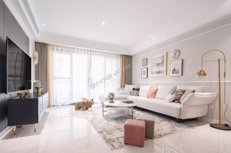 108平米三居室现代美式风格沙发背景墙装修设计效果图