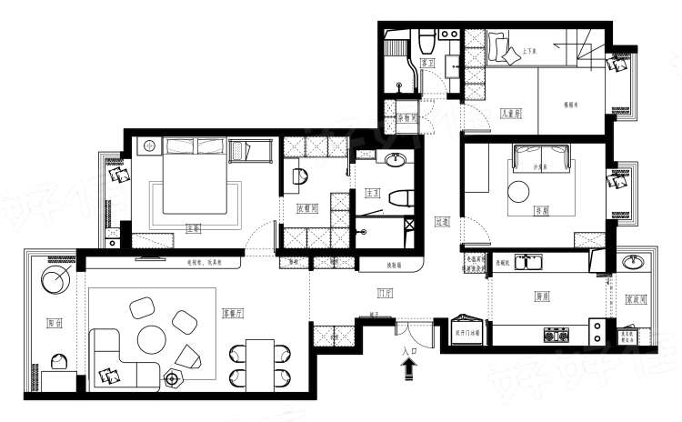 改造前户型结构一进门左侧通向客厅的位置有连续的两个拐角,无论是在视觉上还是使用上都不是很舒服。对业主一家人来说,餐厨空间在整个居室里的面积占比相对来说过大,无效的走道空间过多,主卧套房虽大,利用率却不高。全屋面积不小,舒适性却不高,储物量和功能需求更是远远达不到要求。