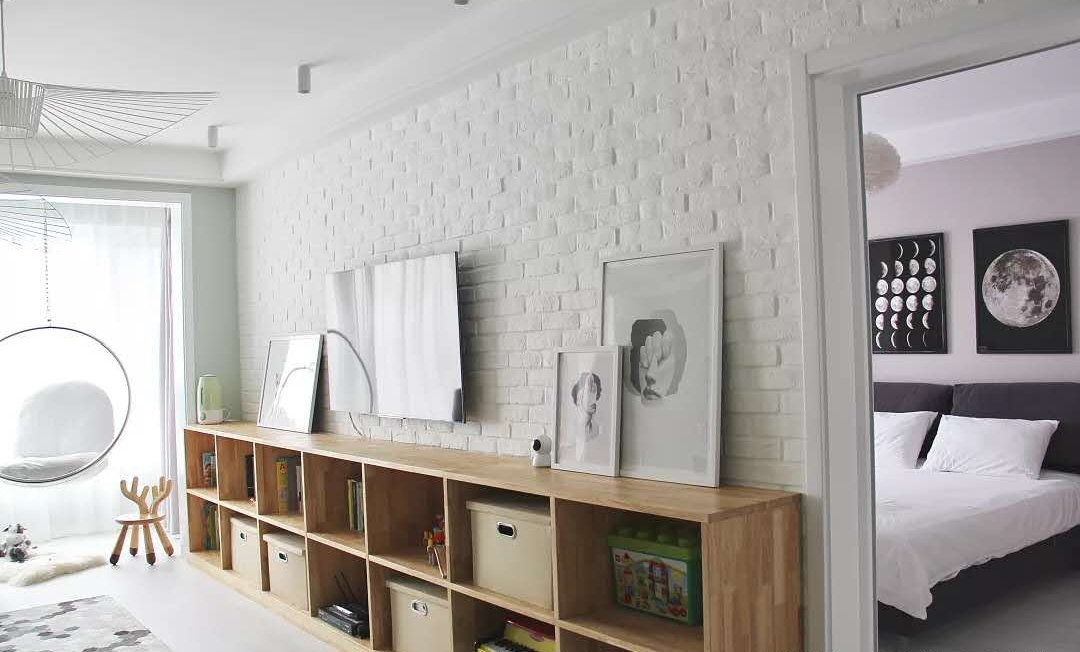 电视背景墙运用文艺范儿的小白砖来打破全屋涂料墙面的单一。电视柜的高度则是依据小朋友的身高来量身定做的,材质上选择了暖暖的橡胶木实木集成材。